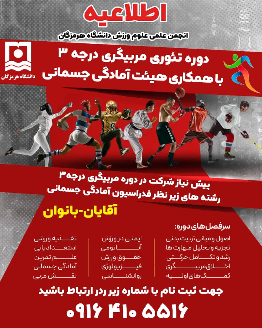 فراخوان نام‌نویسی دوره تئوری مربیگری درجه ۳ آمادگی جسمانی ویژه دانشگاهیان در دانشگاه هرمزگان
