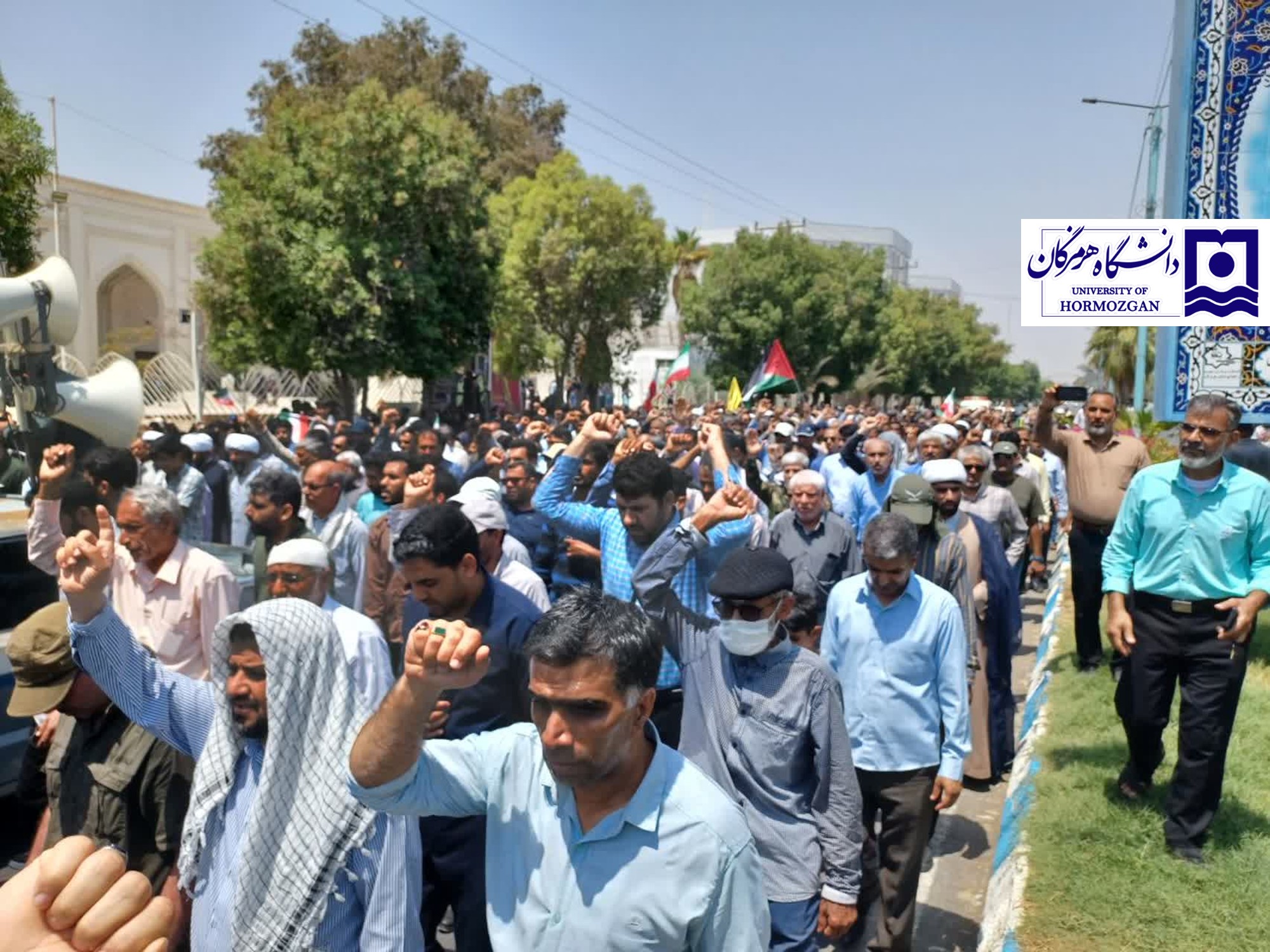 معاونت فرهنگی و اجتماعی دانشگاه هرمزگان در واکنش به این رخداد خونین، طی فراخوانی از خانواده بزرگ دانشگاه، شامل دانشجویان، اساتید و کارکنان، جهت حضور گسترده در راهپیمایی «جمعه خشم و نصر» دعوت به عمل آورد. این مراسم در روز جمعه ۳۰ خرداد در شهر بندرعباس و در گرمای طاقت‌فرسای جنوبی برگزار شد؛ اما این شرایط دشوار، مانعی برای خروش پرصلابت دانشگاهیان و مردم غیور بندرعباس نبود.