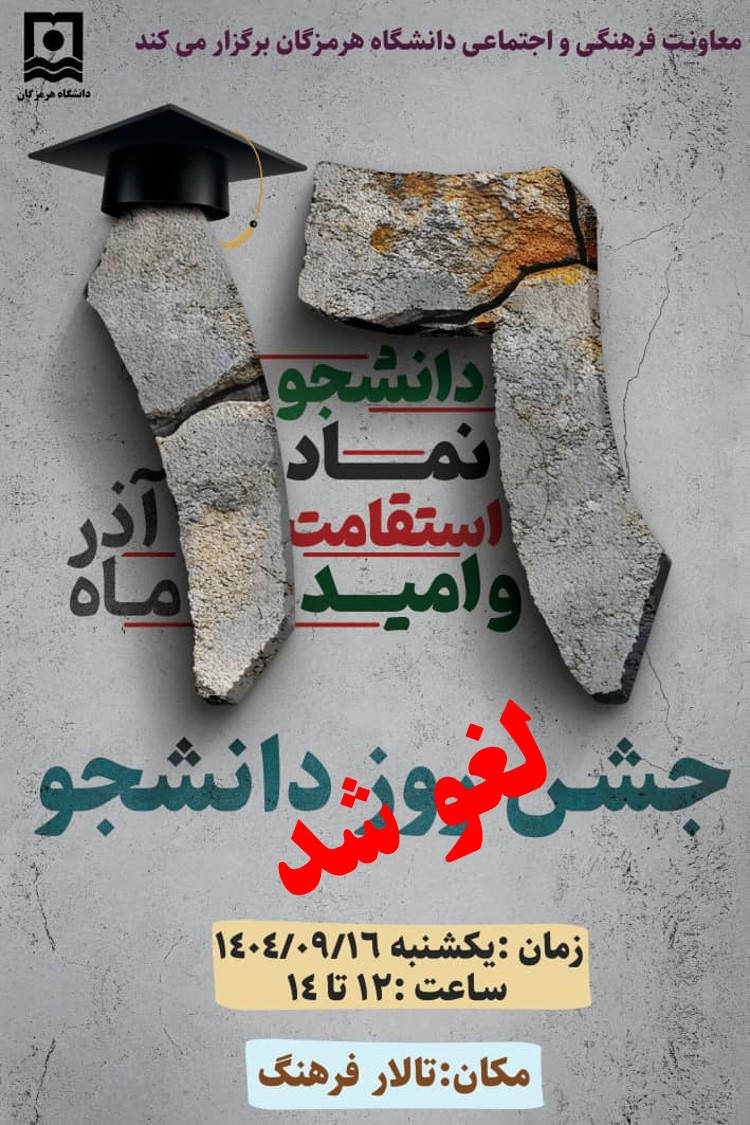 به اطلاع دانشجویان فرهیخته دانشگاه هرمزگان می‌رساند که بر اساس تصمیم هیئت‌ رئیسه محترم دانشگاه مبنی بر غیرحضوری بودن فعالیت‌ها در روز یکشنبه ۱۶ آذر ۱۴۰۴ و با هدف رعایت الزامات بهداشتی و صیانت از سلامت دانشجویان عزیز، برگزاری مراسم جشن روز دانشجو در این تاریخ لغو می‌گردد.